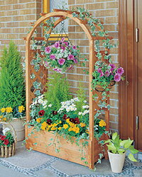 アーチ付のプランターボックスです。ボックス部には一般的なプランターを収納することができます。ツル性の植物を這わせたり、アーチのラダー部分に吊り鉢、ラティスには鉢掛けを飾ることが出来ます。防腐・防カビ効果のある合成樹脂塗料を使い、耐候性に優れています。■商品サイズ(cm):幅約80×奥行約35×高さ約132■耐荷重:ラダー部 各約3kg、サイドラティス 約3kg、底板 約16kg■主要材質:天然木*写真は使用シーンです。鉢・花は商品に含まれせん。