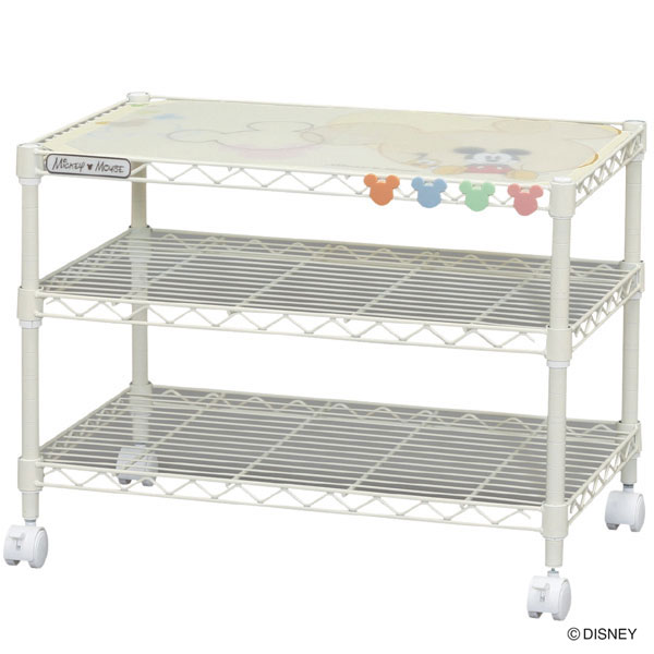 ミッキーのエンブレムとシートが付いた、かわいいカラーメタルラックタイプのTV台です。薄型26Vまで対応。可愛いながら落ち着いたアイボリーカラーなので、リビングにもぴったり♪お掃除や移動もラクラクのキャスター付き!★お客様組立★ネジ・クギ不要の簡単組み立て商品で、ソフトハンマーがあれば、すぐに組み立てられます。●商品サイズ(cm)幅約59.5×奥行約37×高さ約45.5(キャスター含む)●商品重量約4.9kg●耐荷重棚板1枚あたり約30kg、全体(静止時)約90kg、全体(走行時)約50kg●棚板3枚●主要材質棚板・ポール:スチール(エポキシ粉体塗装)固定部品・エンブレム:ABS樹脂キャスター: